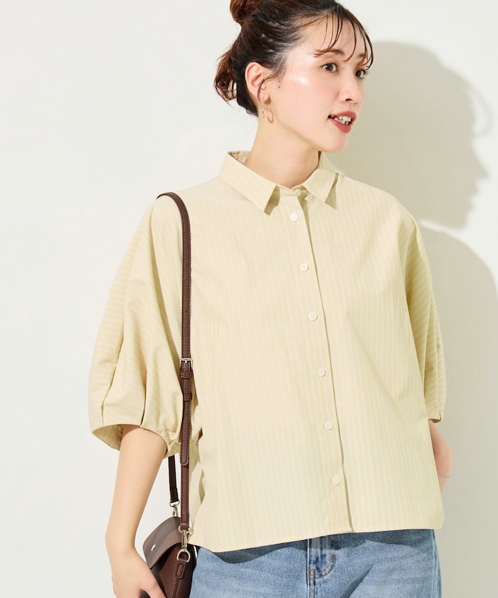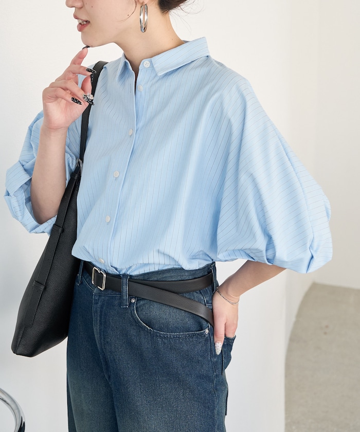 ボリュームがスリーブ美しいショートシャツは、ハイウエストのスラックスと合わせればオフィスカジュアルにも着ていただけます◎足元はローファーで品よくまとめるのがおすすめ。