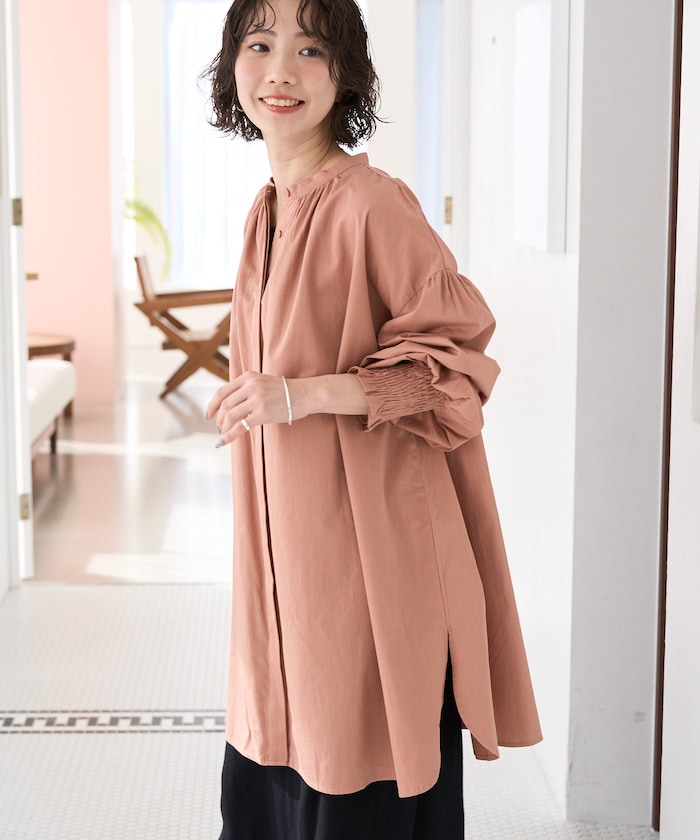 ●顔まわりをすっきり見せるバンドカラーですっきりと