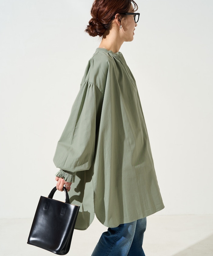 ふんわりしたシルエットに丈感も長めなブラウスは、フレアデニムやIラインスカートなどボトムでバランスをとるのが◎