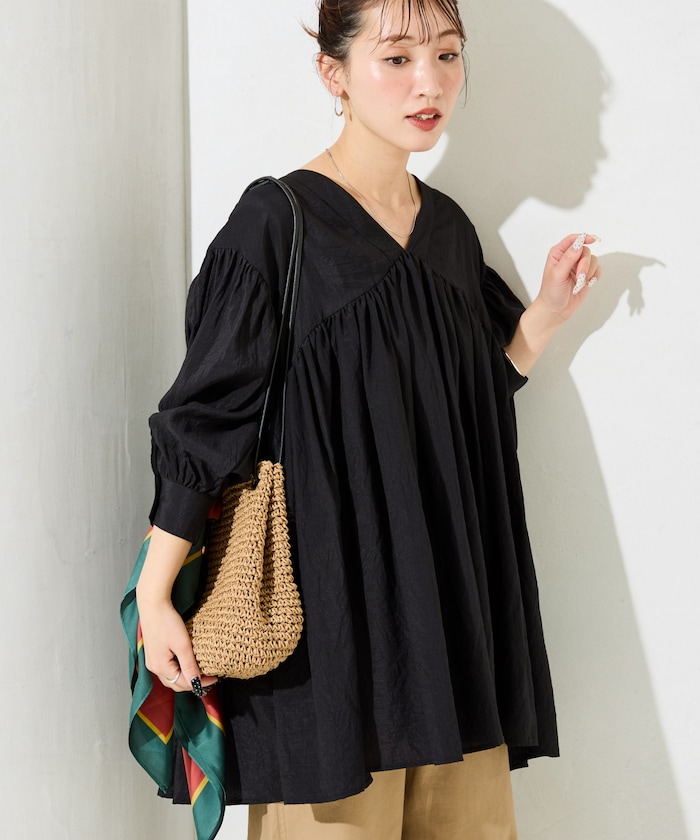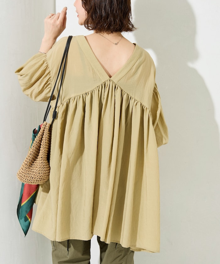 ●衿元から入ったギャザーが、ふんわりとした立体感のあるシルエットを演出