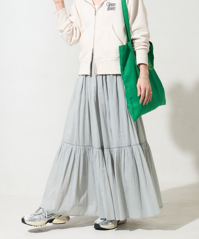 汎用性が高く大人カジュアルなコーデが完成するコットンスカートは、Tシャツ×キャップ×スニーカーのどカジュアルなスタイリングもどこか上品な印象に!