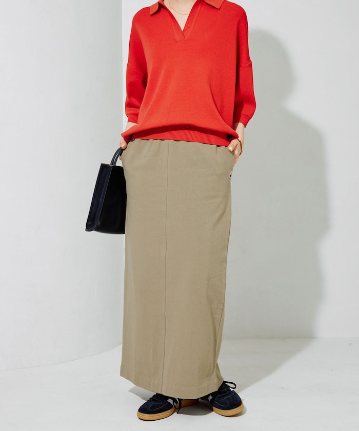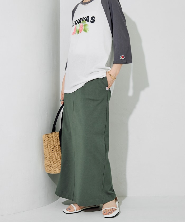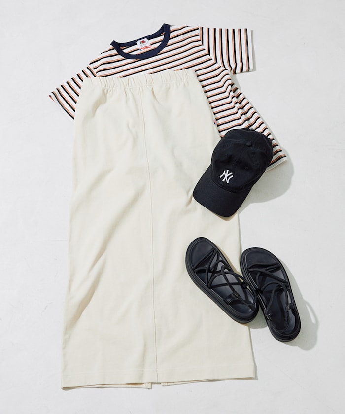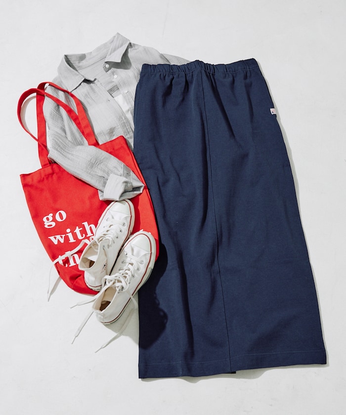 シンプルなIラインスカートは、チェックシャツやロゴTと合わせてラフに着こなすのがおすすめ。