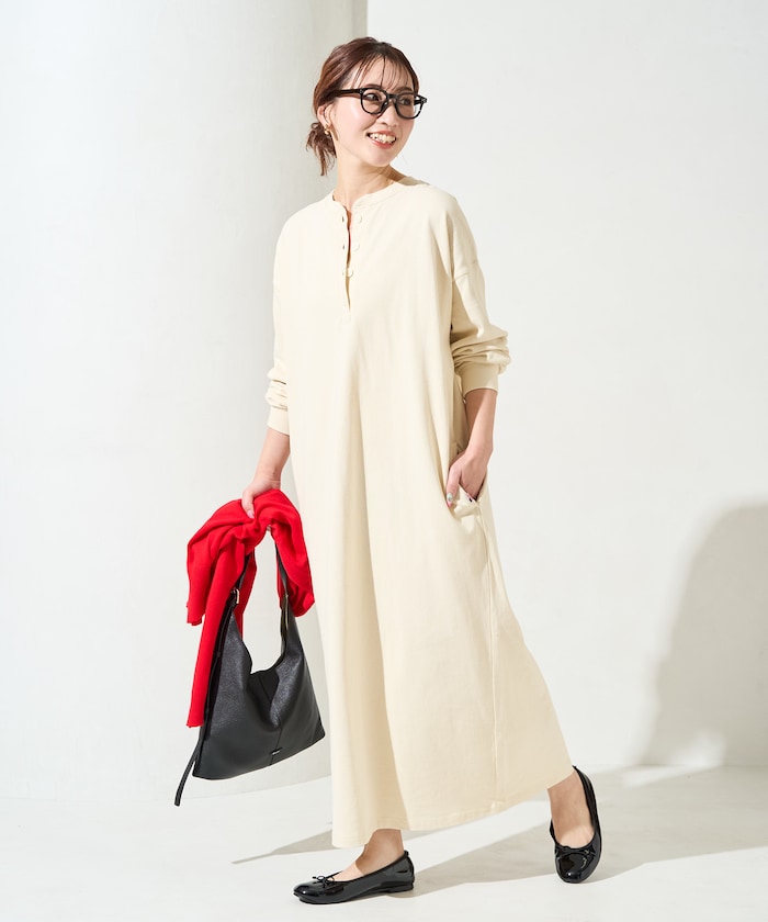 ヘンリーネックのデザインで、シンプルながら1枚でサマになるコットンワンピース。小さ目のバッグとスニーカーを合わせるワンマイルスタイリングはもちろん、デニムをレイヤードしてシャツを腰巻きすればお出かけスタイリングにも◎