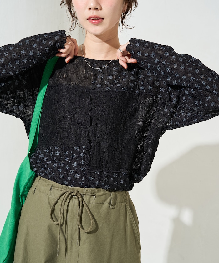 ●小花柄プリントとレースを組み合わせたパッチワークデザイントップス