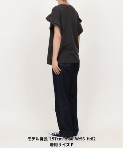 程よく甘めのフリルTシャツはカーブデニムやワイドパンツなどカジュアルなルックがおすすめ。