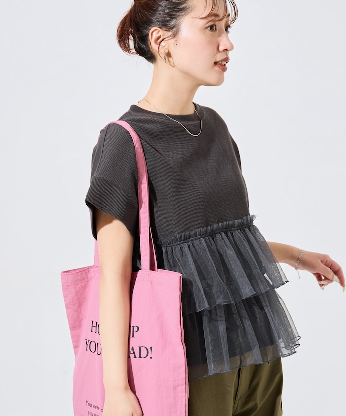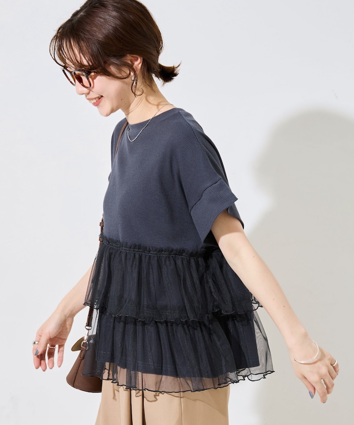 ●フェミニンなチュール×ラフなワッフルのレイヤードドッキングがアクセントの半袖Tシャツ