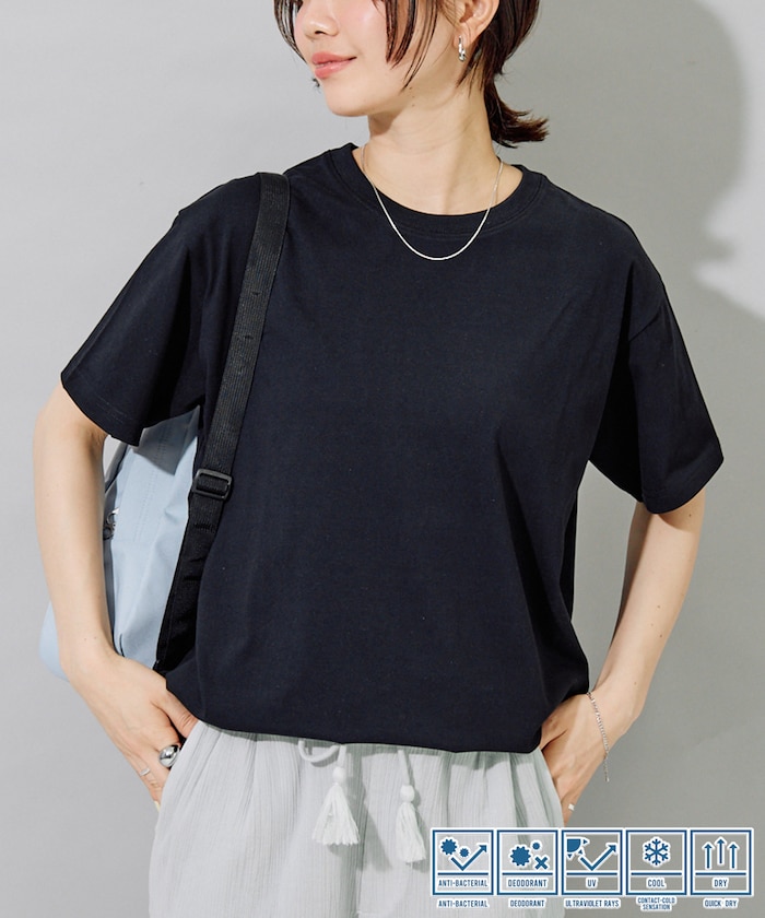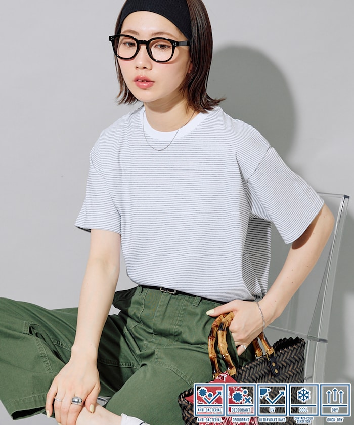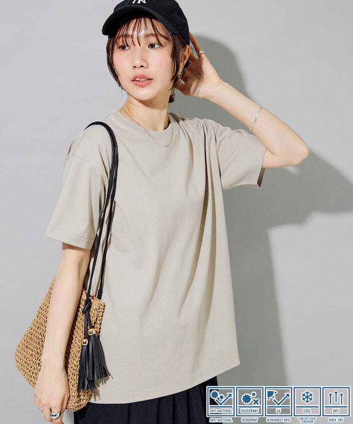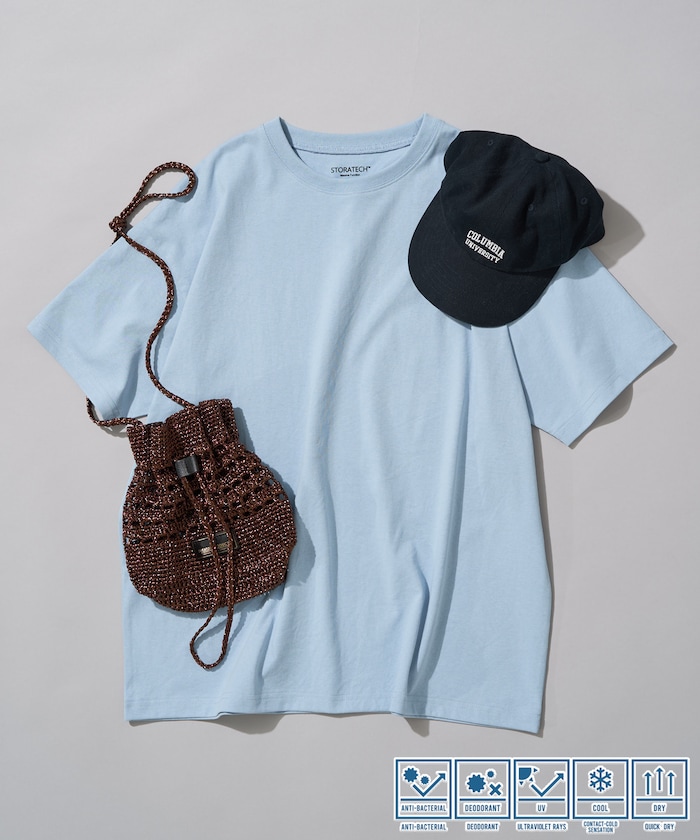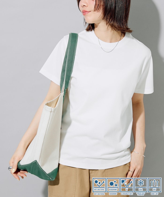 生地をプレーティングで編むことでUVカット機能が生まれ、肌の接触面には吸水速乾、接触冷感機能を搭載、外観はUSAコットンの豊かな風合いを楽しめます。