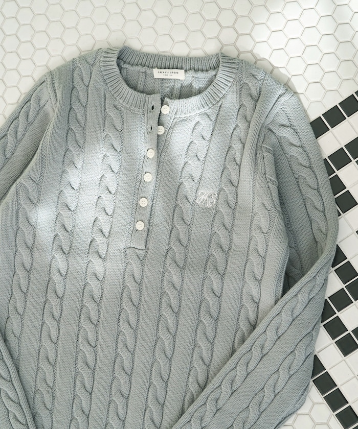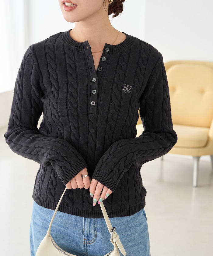 華奢な刺繍ロゴとケーブルニットがクラシカルな印象のヘンリーニット