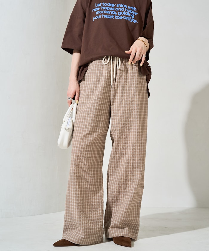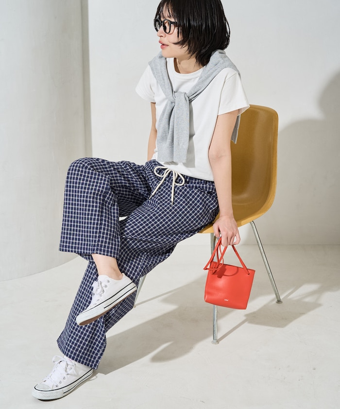 チェック柄パンツは、無地TシャツやロゴT、シンプルなシャツと合わせることでバランスよくまとまり大人カジュアルなスタイリングに。