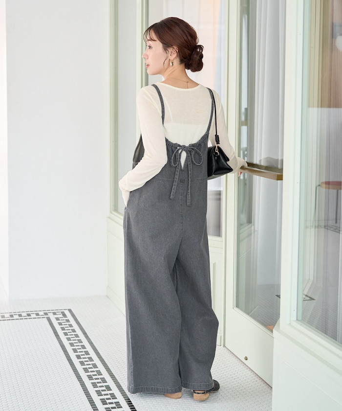 ラフになりがちなサロペットもリボン付きで女性らしい印象に!