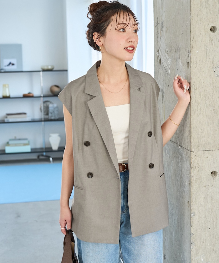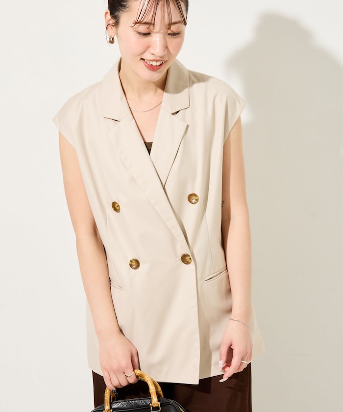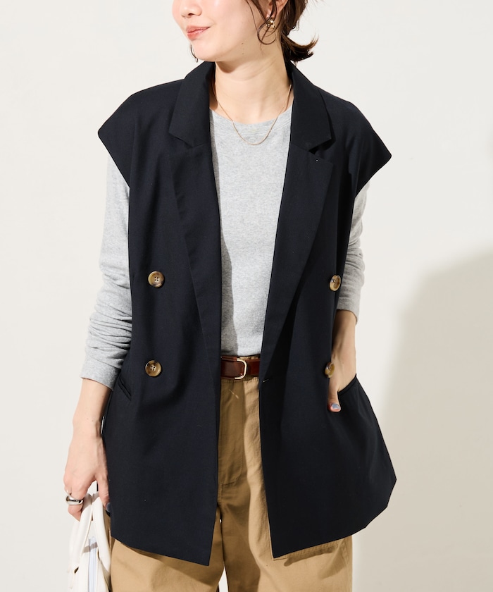 ●落ち感のある生地ながらダブルボタンできちんと感も演出するジレ