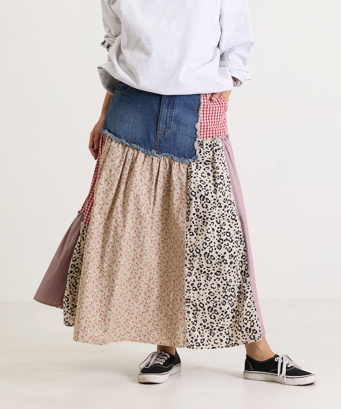 ●デニムやミリタリーのパンツをリメイクしたようなデザインのスカート。プリント生地を4柄使用し切り替えています。