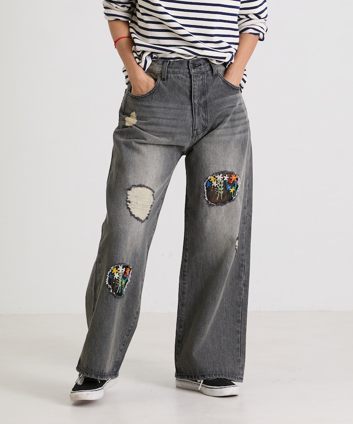 ●デニムを縫製し、古着に見えるような加工をしたあと、一度デニムの脇を解体して花刺繍の生地をたたきつけもう一度脇を縫い合わせるという大変手間のかかった商品です。