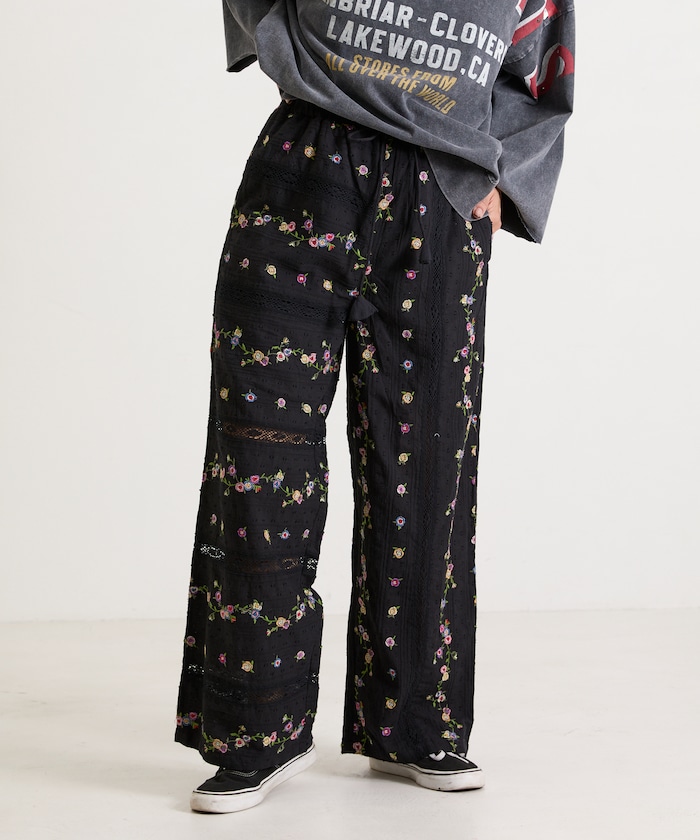 刺繍とレースを重ねた、表情豊かなイージーパンツ