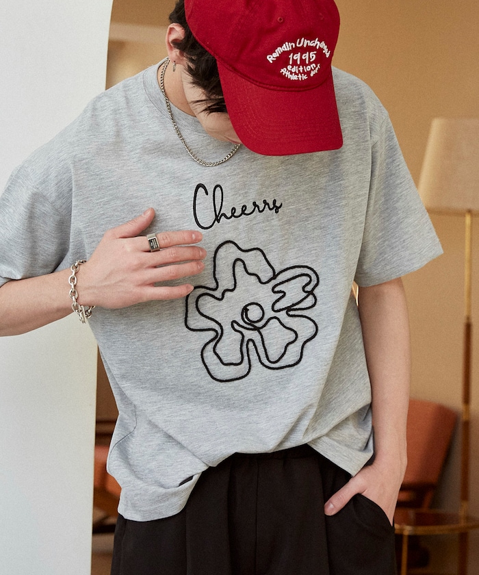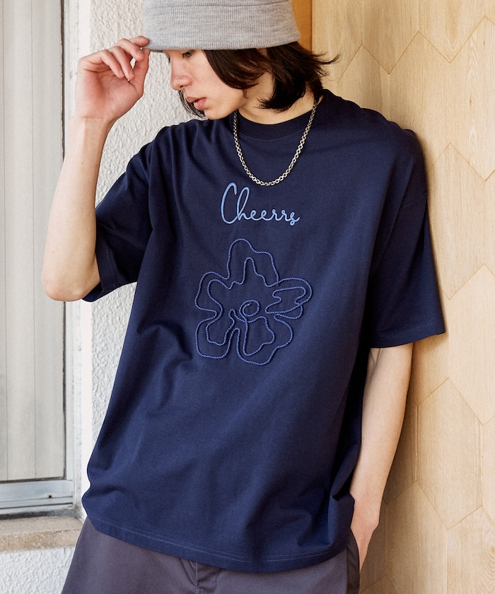 ●立体感のあるコード刺繍で表現したフラワーモチーフが主役の一枚。ラフな手書きタッチと“Cheers”ロゴが遊び心をプラス