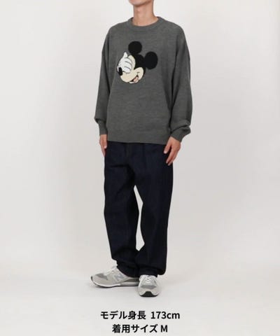 アウターを羽織る際は、ミッキーのジャガード柄が隠れないように、ゆったりとしたサイズのアイテムを選ぶのがポイントです。