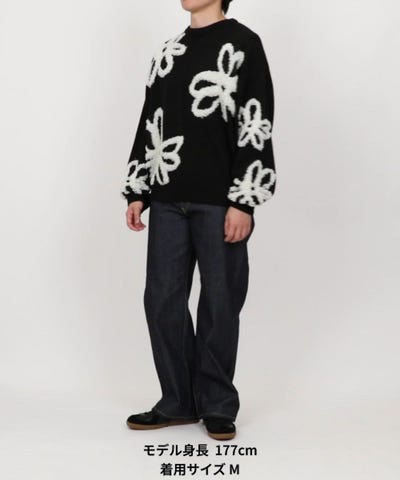 ●ベースとなるジャガードニットに、立体感のあるブークレ素材で花柄をデザイン。見る角度によって表情を変える独特の風合いが魅力です。