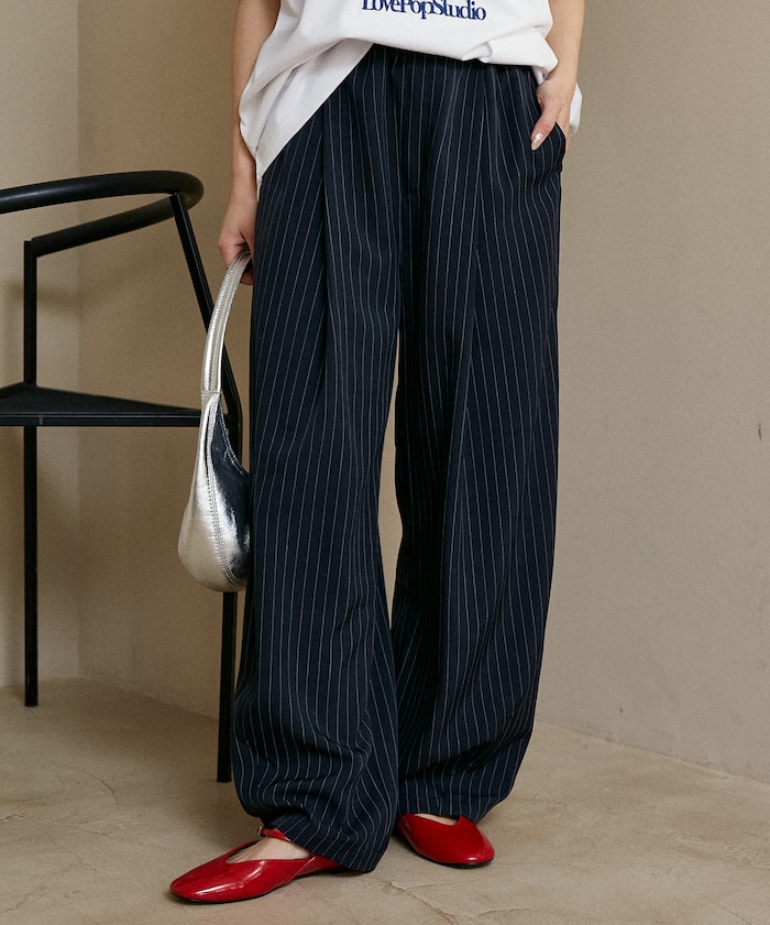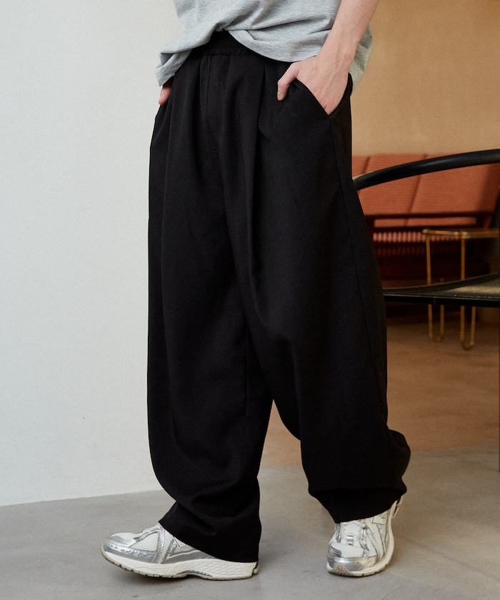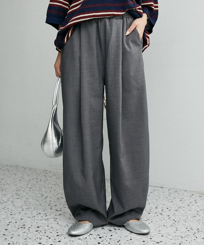 ●ウエストは総ゴム仕様でリラックス感のある穿き心地。イージー仕様ながら、フロントのタックでスラックスらしいきちんと感をプラス