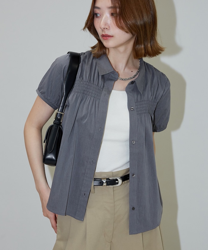 シャーリングディテールが上品なアクセントになる、レディライクな半袖シャツ