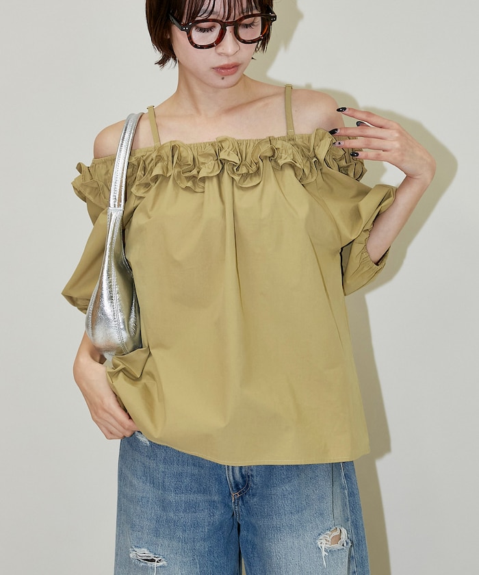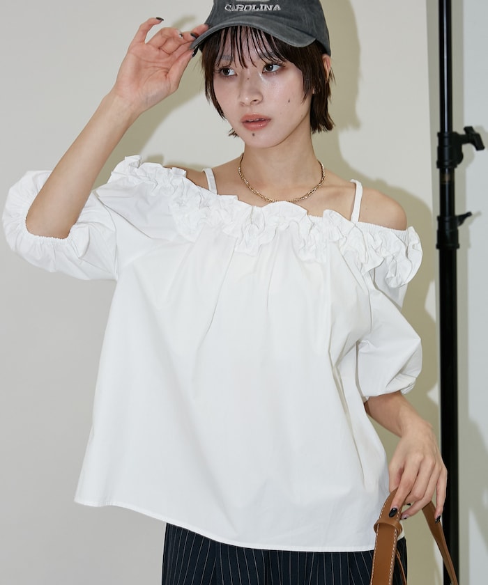 フリルデザインが目を引く、女性らしいオフショルダーブラウス