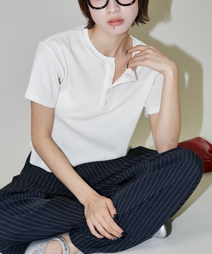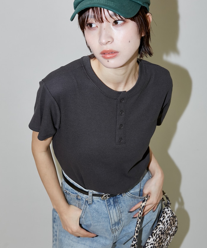 ●ヘンリーネックデザインが、シンプルながらも程よいアクセントに