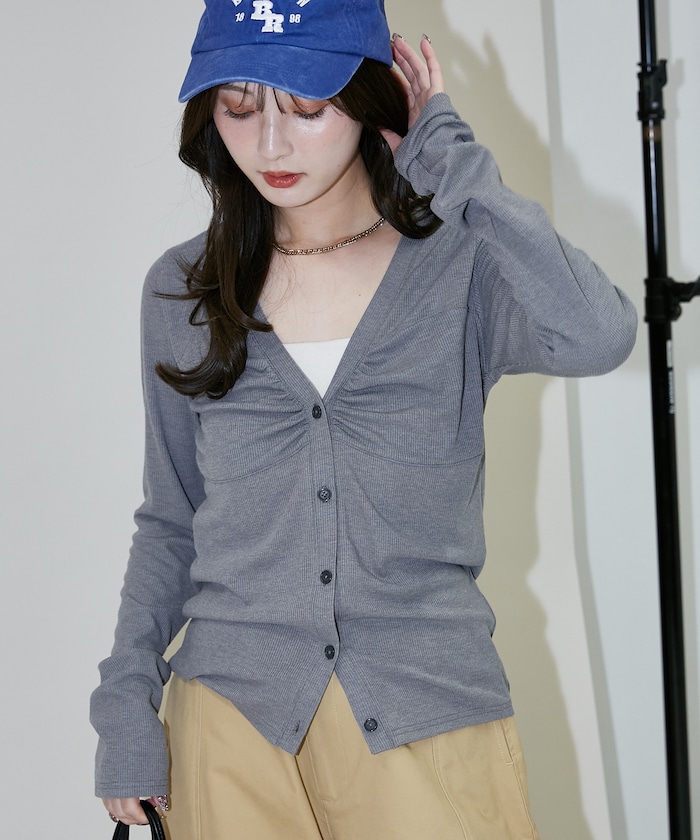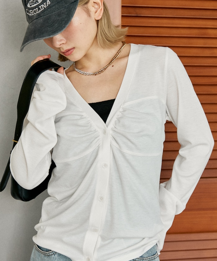 ●胸元にあしらったギャザーデザインで、まるでインナーを重ねたようなレイヤード風ディテールが楽しめる1枚
