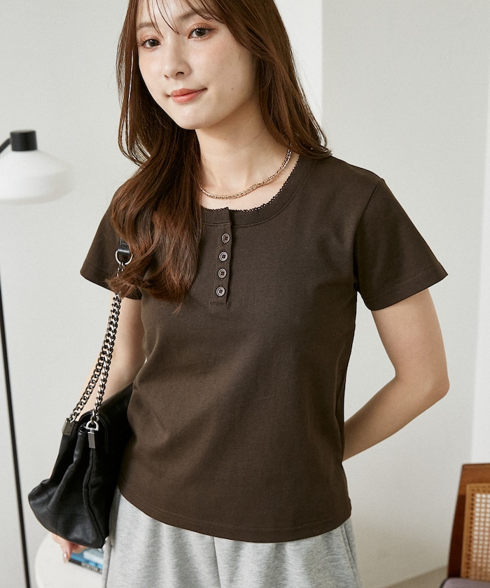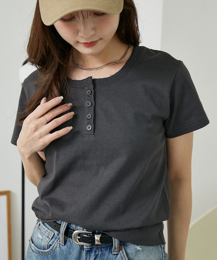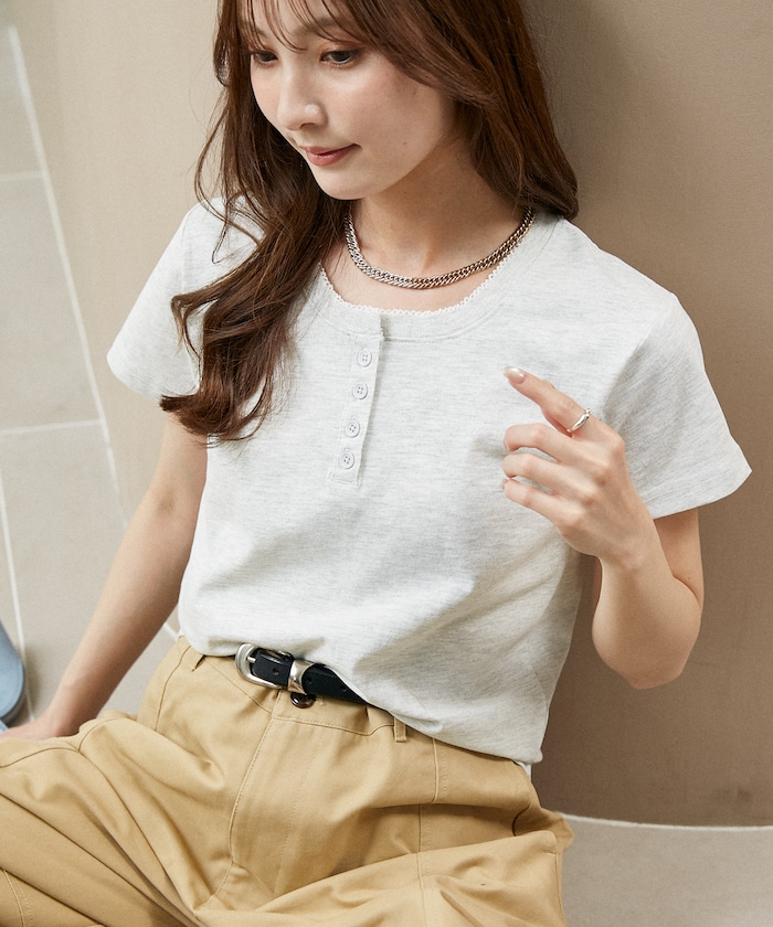 ピコレース×ヘンリーネックで、さりげなく女性らしさをプラスしたコンパクトTシャツ