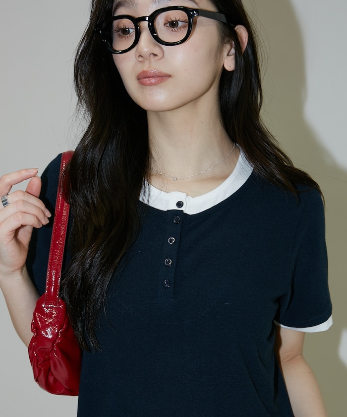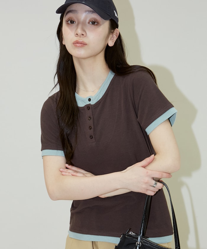 1枚でレイヤード見えが叶う、配色デザインのヘンリーネックTシャツ
