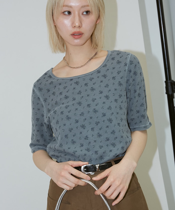 表情のあるワッフル素材と春夏らしさ満載の小花柄が魅力のデザインTシャツ