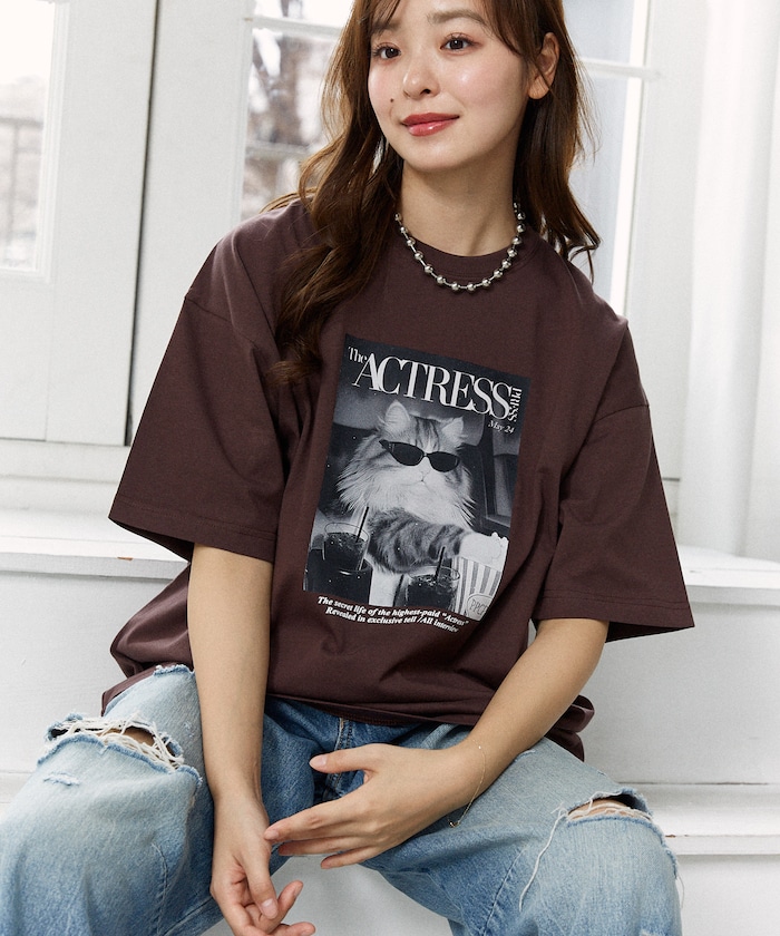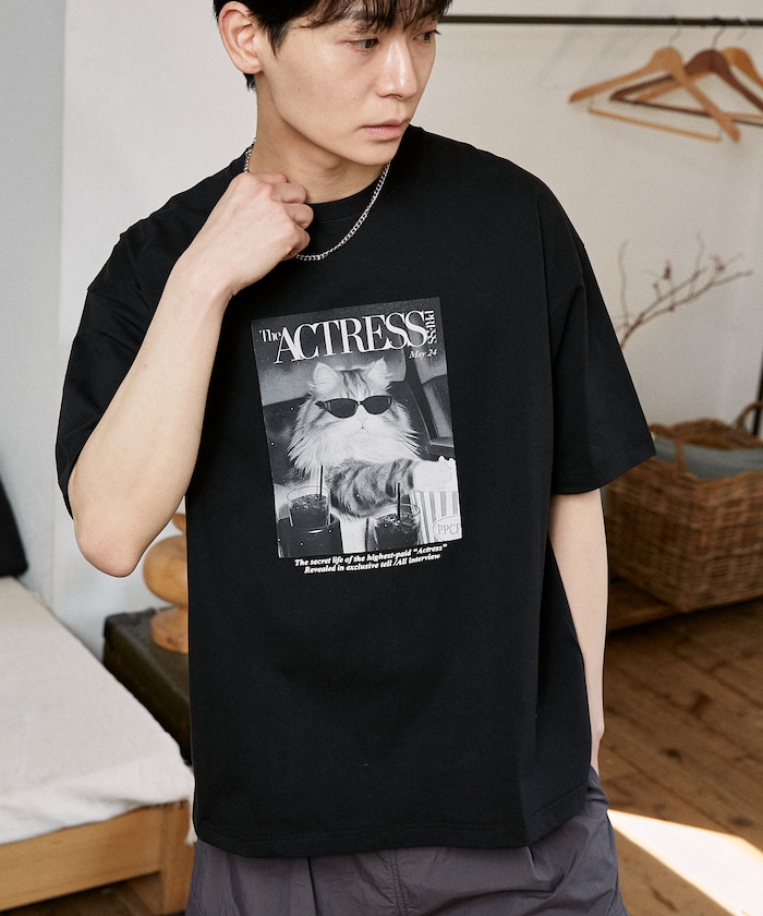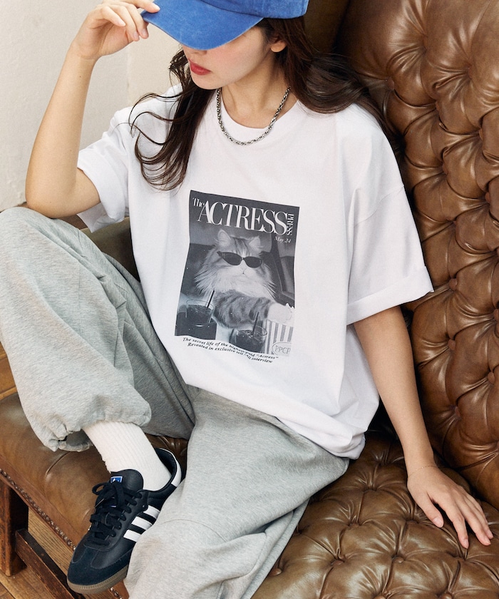 存在感のあるフォトプリントが目を引くキャットTシャツ