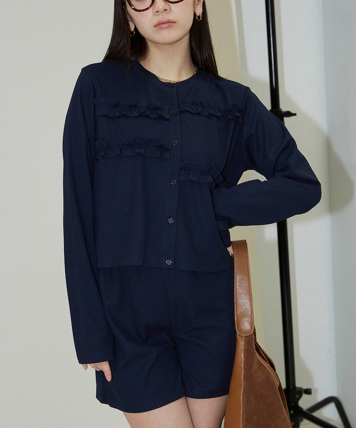 ●フロントにあしらったフリルデザインが、シンプルながら華やかさをプラスするカーディガンとショートパンツのセットアップ