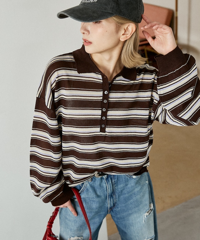 シアーな透け感とマルチボーダーが目を引く、ニットポロシャツ