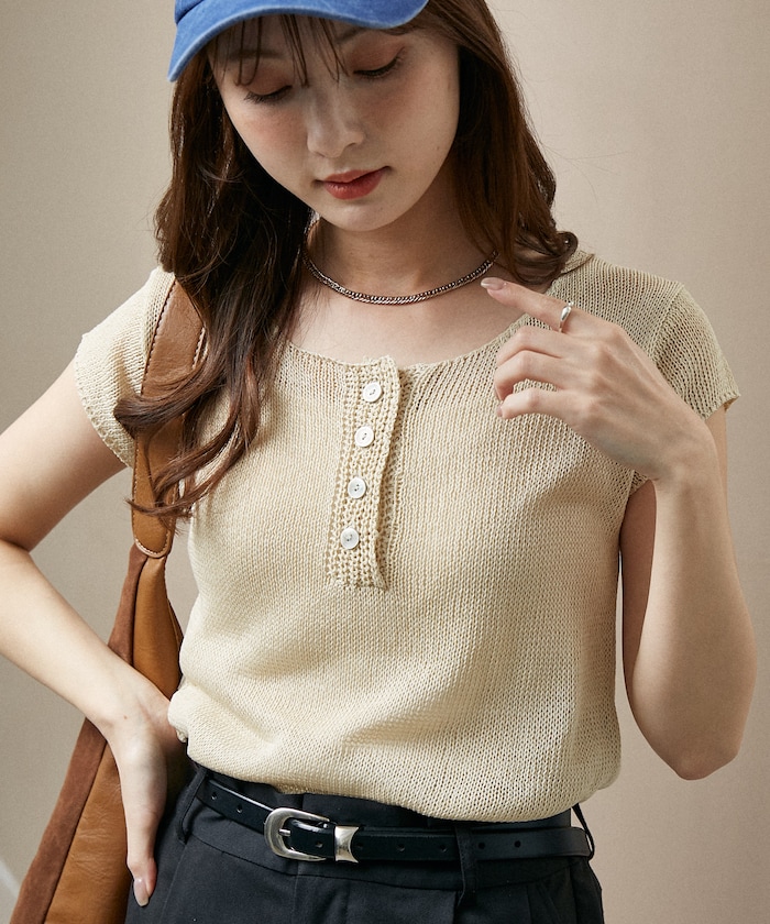●ヘンリーネックデザインが、シンプルながらさりげないアクセントに