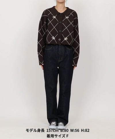 花刺繍が映える、モードな線画ダイヤ柄ショートカーディガン
