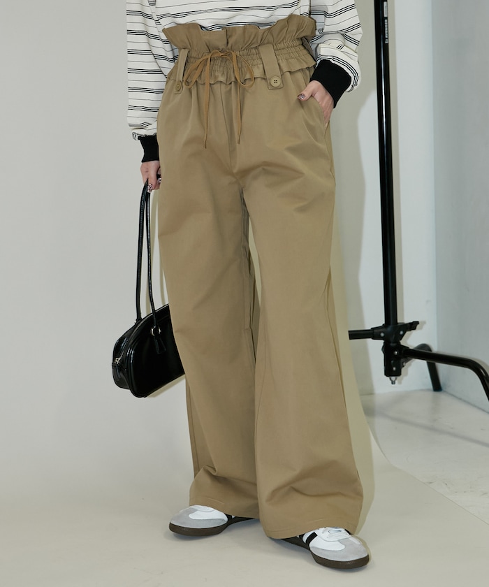シャーリングデザインがポイントのハイウエストイージーパンツ