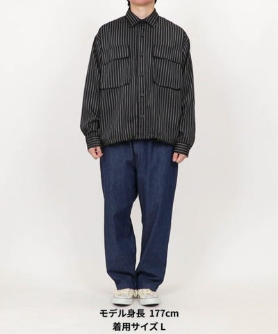 同素材のワイドパンツと合わせたセットアップスタイルがおすすめ。インナーは無地Tシャツやタンクトップでミニマルにまとめることで、ストライプ柄とシルエットの存在感が際立ちます。単品使いならデニムやスラックスとも相性が良く、裾のスピンドルを絞ることで着丈バランスを調整でき、スタイリングの幅が広がる一着です。