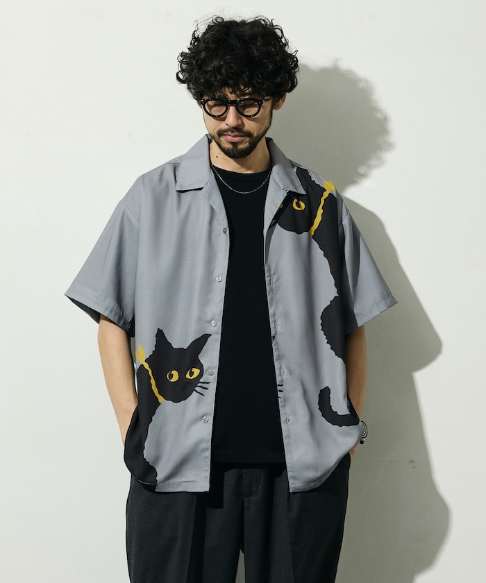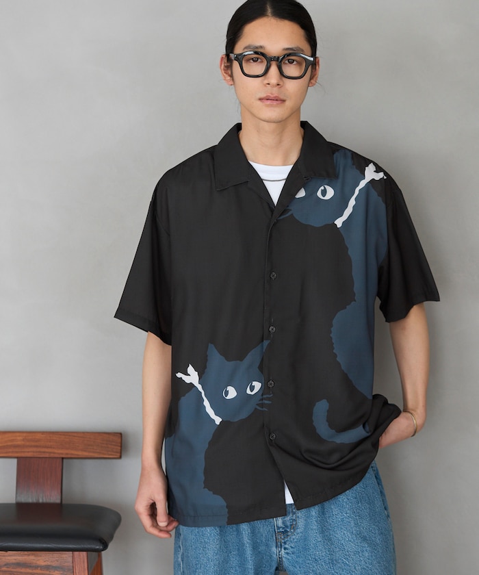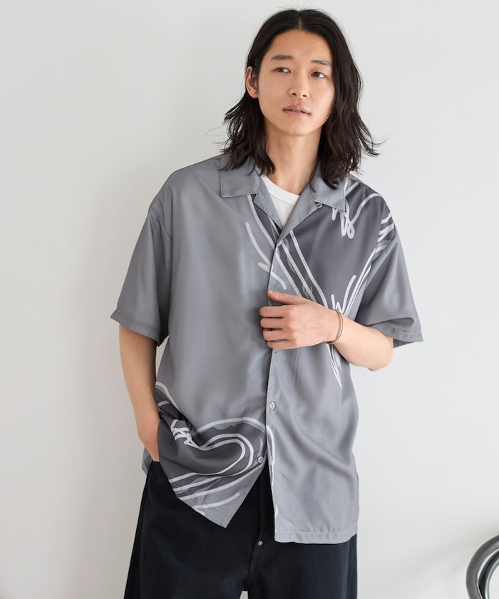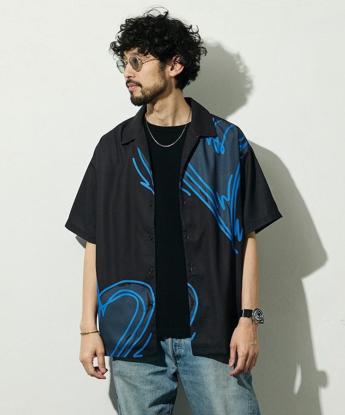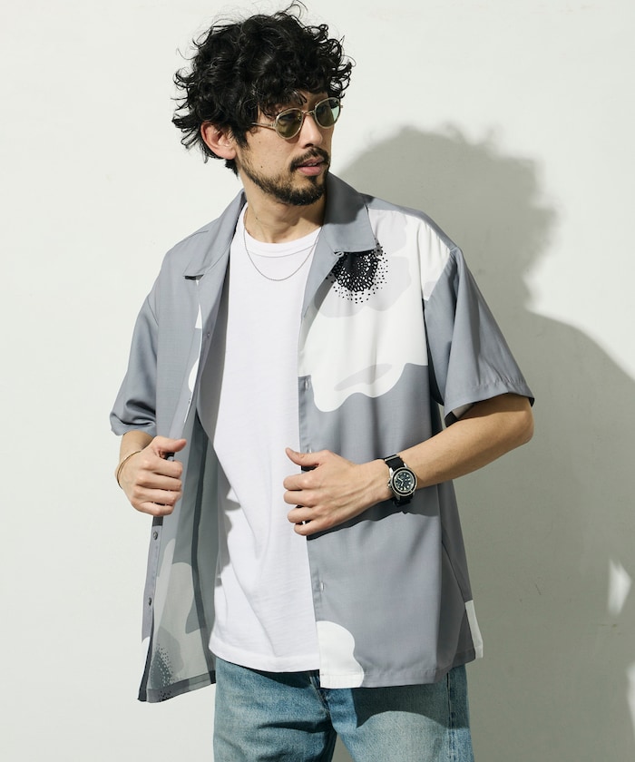 ●大胆に配置されたビッグパターンが印象的な半袖オープンカラーシャツ