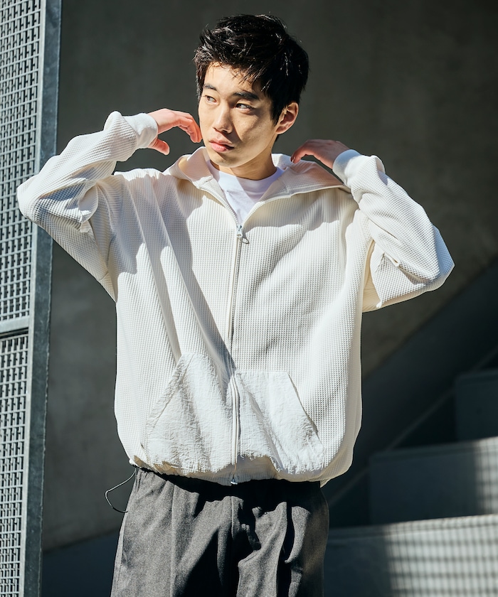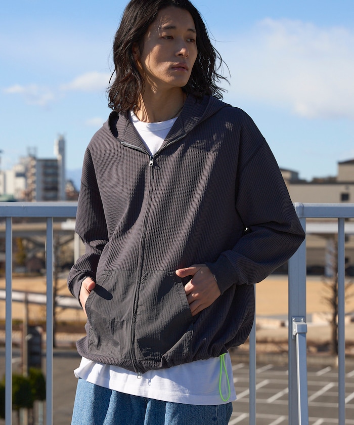 ●サーマル素材にナイロンポケットを組み合わせた、テック感のあるジップアップパーカー