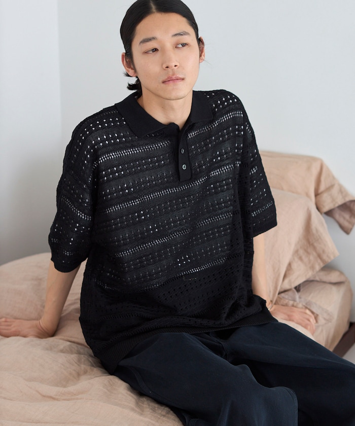 ●透け感のある編み柄デザインが特徴で、シンプルながらもコーディネートのアクセントになるニットポロ