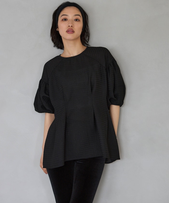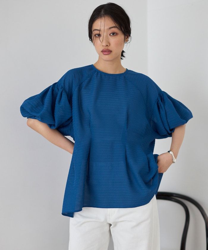 ●ハリ感のある素材で、立体的に仕上げたバルーンスリーブがアクセント
