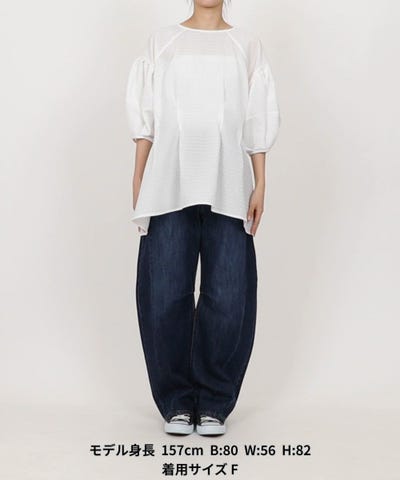 ボリューム袖を活かして、シンプルなボトムと合わせるだけでも着映えるスタイリングが楽しめます。