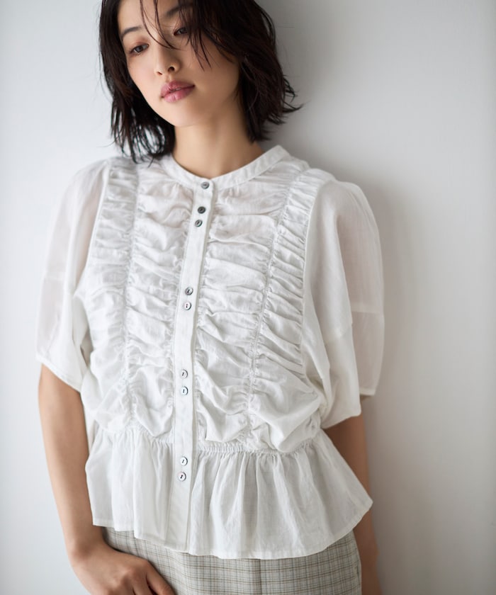 ●薄手の程良いシアー感のある素材に、たっぷりとシャーリングを施したデザインブラウス