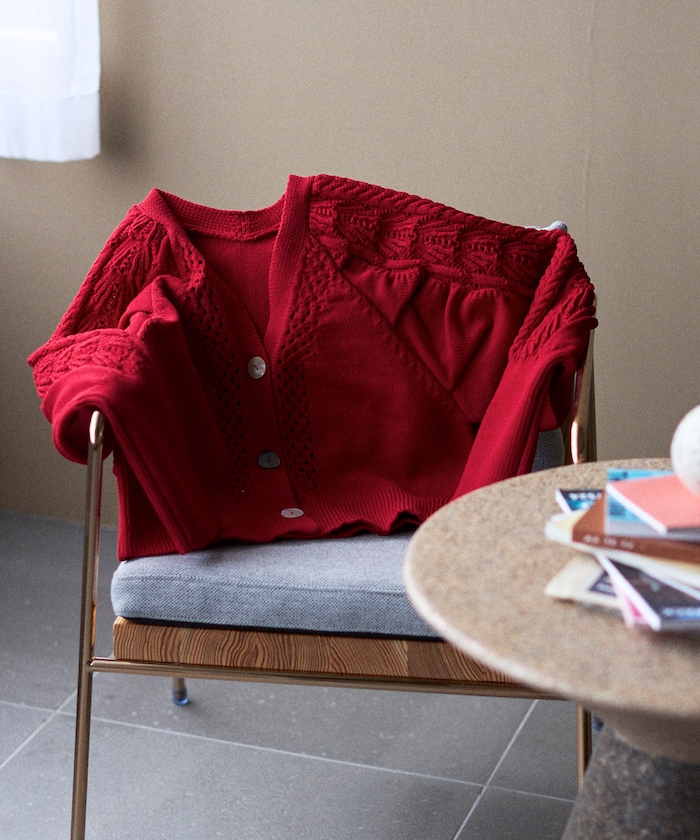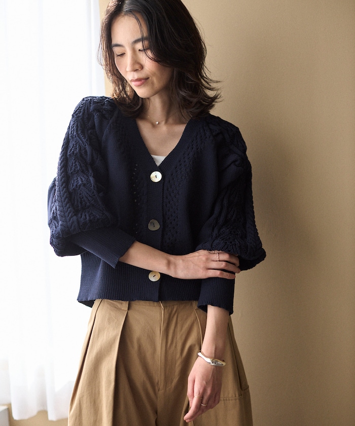 立体柄と貝釦で、羽織るだけで差がつく。デザインニットカーディガン