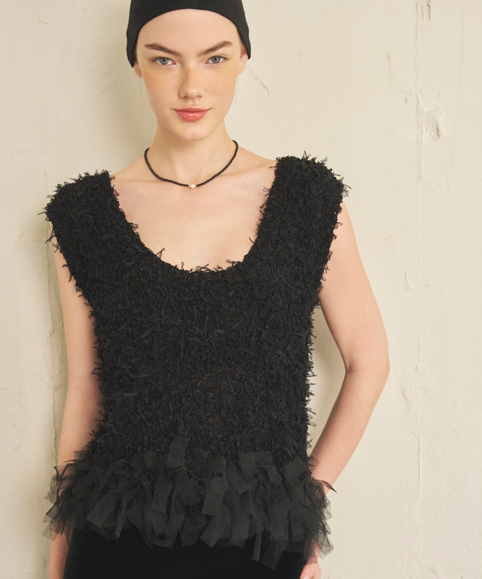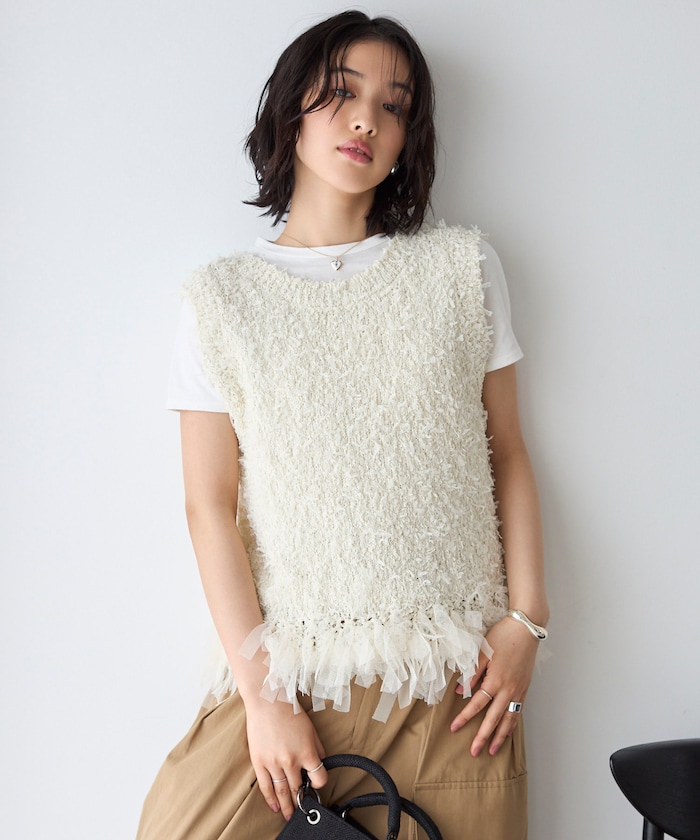 ●立体感のあるニットの柔らかな肌触りとレースフリンジがアクセントになるベスト