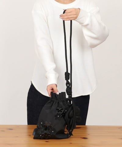 花のパッチが印象的な巾着ショルダーバッグ