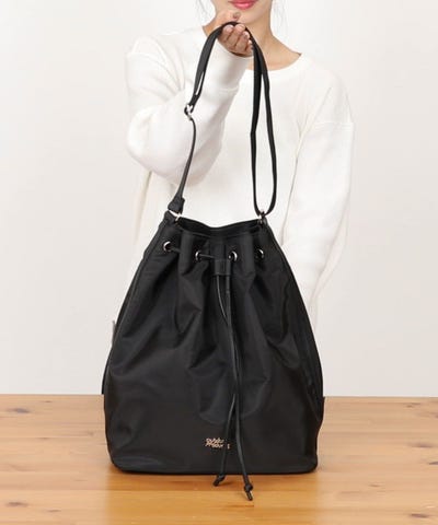 ●ロゴプレートを配した、巾着デザインショルダートート
