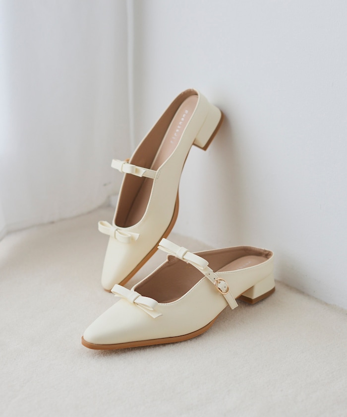 ●履きやすいミュールデザインに2つのリボンをレイアウトした目を引くアイテム