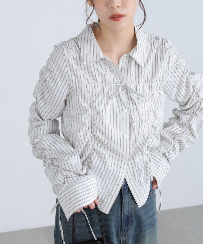 縦横シャーリングデザインで表情ゆたかに仕上げたシャツ。
