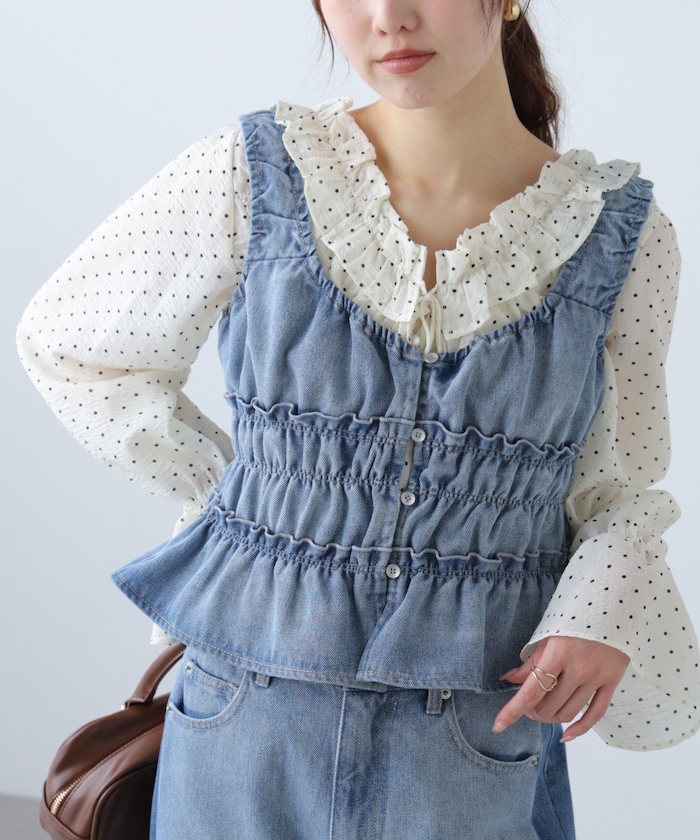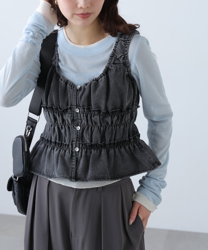 シャーリングを施し柔らかな印象に仕上げたデニムビスチェ。
