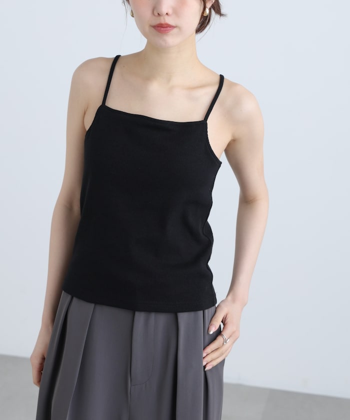 胸元は開きすぎないスクエアラインで、シアーシャツのインナーとしても使いやすくておすすめです。